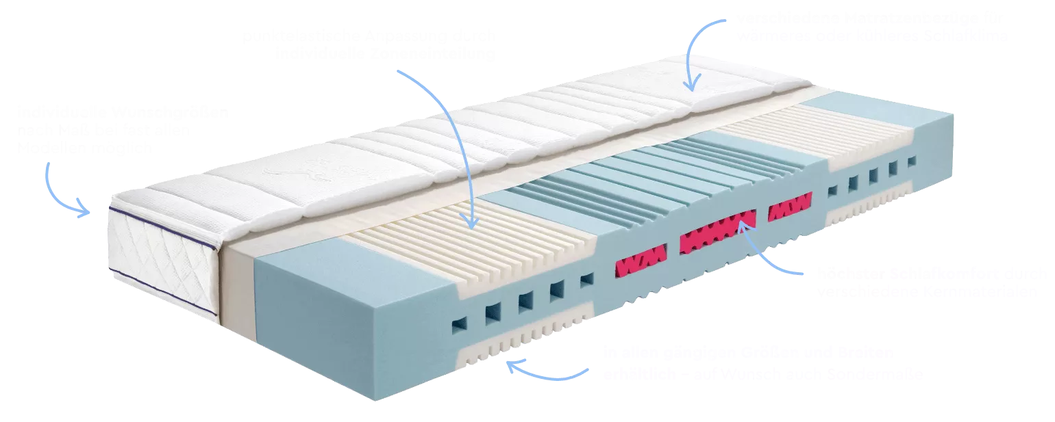 Die Matratzenkerne sind in 7 verschiedene Körperzonen (Liegekomfortzonen) unterteilt. Ein softiger Schulterbereich muss ein tieferes Einsinken der Schulter ermöglichen, damit die Wirbelsäule in Seitenlage eine gerade Linie bilden kann. Wichtig dabei ist eine aufgelöste Oberflächen-Struktur der Matratze.