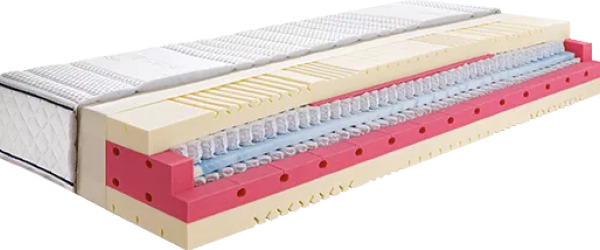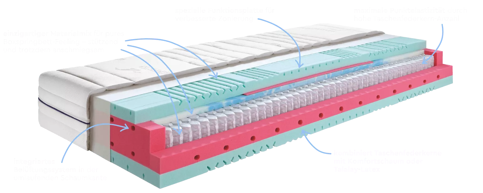Den ganz besonders anschmiegsamen, druckentlastenden und gleichzeitig an den relevanten Körperpartien stützenden Schlafkomfort bietet die ca. 25 cm hohe Tonnentaschenfederkernmatratze MT 631L kombiniert mit Talalay-Latex Funktionsplatte und Highfeel-Schaum. Ein unvergleichbarer Schlafkomfort, der die Vorteile der drei einzelnen Materialien miteinander kombiniert.